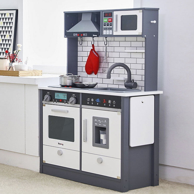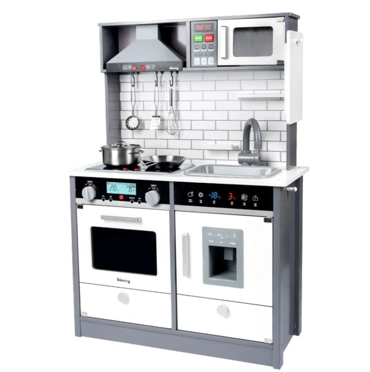 Preslatka dečija kuhinja dolazi u obliku prave kuhinje i dočarava stvaran izgled, omogućava devojčicama bezbrižnu igru i mogućnost da budu ‘kao mama’. Ova kuhinjica kreirana je u stvarnim dimenzijama svih delova prilagođenim visini dece, u kombinaciji sive i bele boje. Komplet je napravljen od kvalitetnog materijala drveta, a svaki od delova su izuzetne izrade, elegantni i napravljeni tako da budu skoro pa isti sa pravim delovima u kuhinji. Delovi koji čine ovu kuhinju kompletnom su: napa, mikrotalasna, šporet, šerpa, tiganj, sudopera, slavina, kuhinjski escajg, dasčica, posuda, rerna, ledomat, fioke. Ova dečija čarobna kuhinja u sebi ima kao sastavni deo mikrotalasnu koja se savršeno uklapa uz ostale delove, a kao dodatak svemu su ugrađeni i svetlosni efekti koji simuliraju ceo process kuvanja i korištenja kuhinje kako bi zabava i igra bili što verodostojniji i kvalitetniji. Za ovaj dodatak biće potrebne i dve AA baterije koje ne dolaze u kompletu ovog seta.