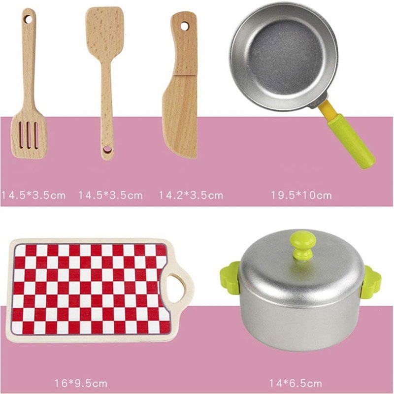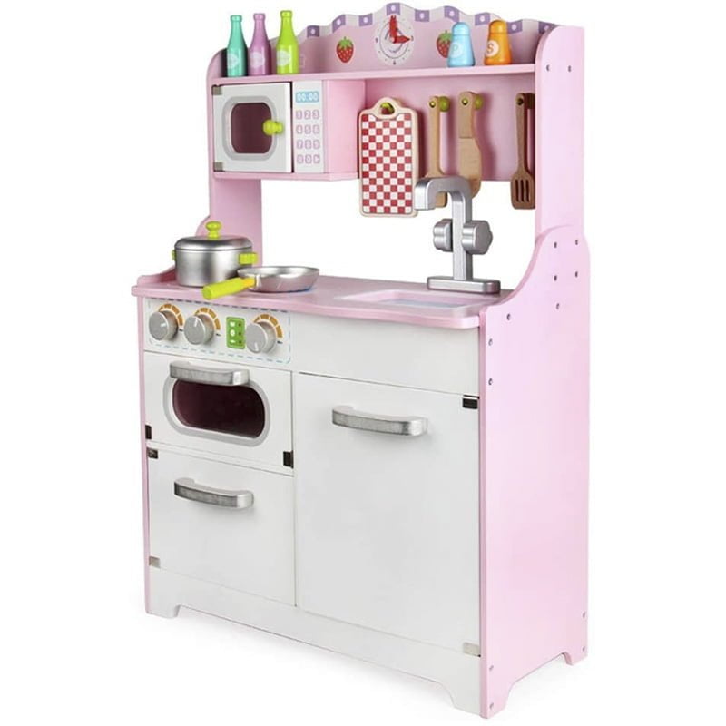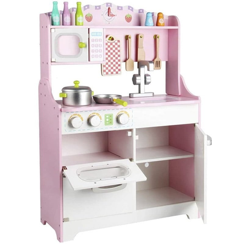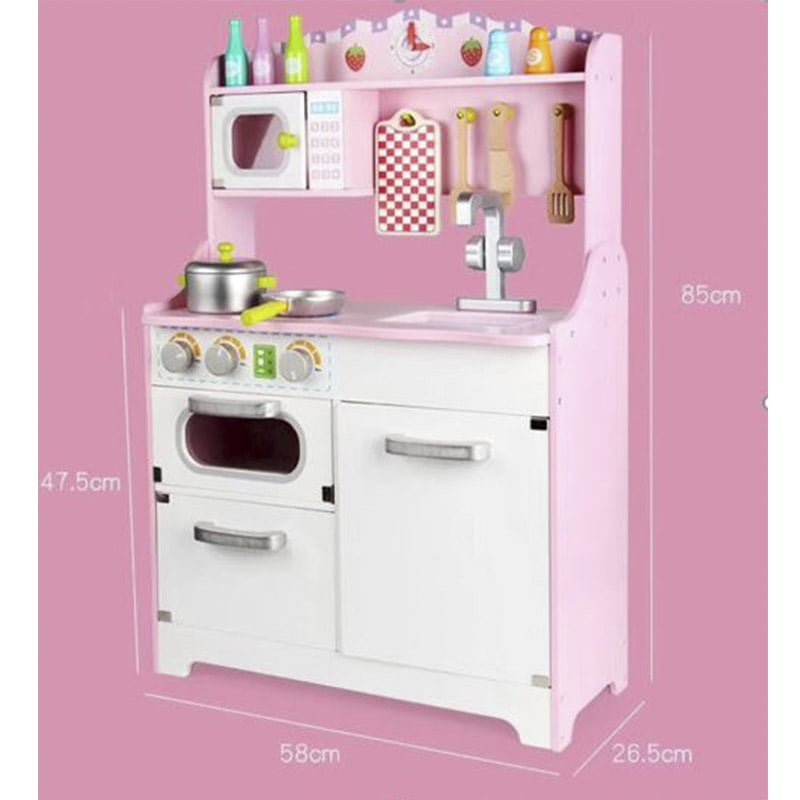 Preslatka dečija kuhinja dolazi u obliku prave kuhinje i dočarava stvaran izgled, omogućava devojčicama bezbrižnu igru i mogućnost da budu ‘kao mama’. Ova kuhinjica kreirana je u stvarnim dimenzijama svih delova prilagođenim visini dece, u kombinaciji roza i bele boje. Komplet je napravljen od kvalitetnog materijala drveta, a svaki od delova su izuzetne izrade, preslatki, puni detalja i motiva za devojčice. Delovi koji čine ovu kuhinju kompletnom su: tri flašice za sok, posude za so i biber, mikrotalasna, dasčica, drveni escajg, šerpica, tiganj, slavina, sudopera, rerna, ormarići. U ovoj kuhinjici kao sastavni deo nalazi se i mikrotalasna koja se savršeno uklapa uz ostale delove.