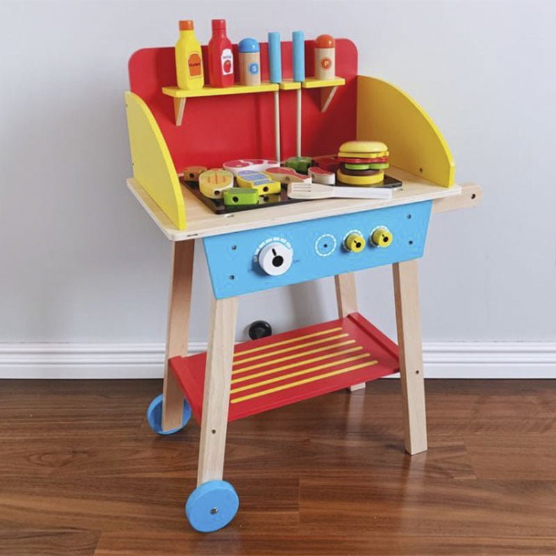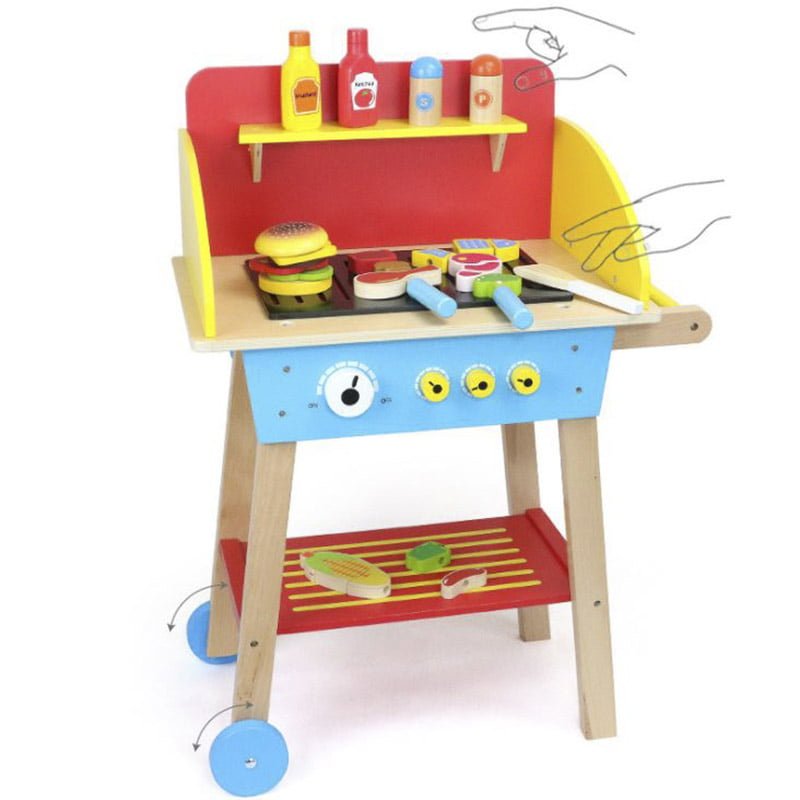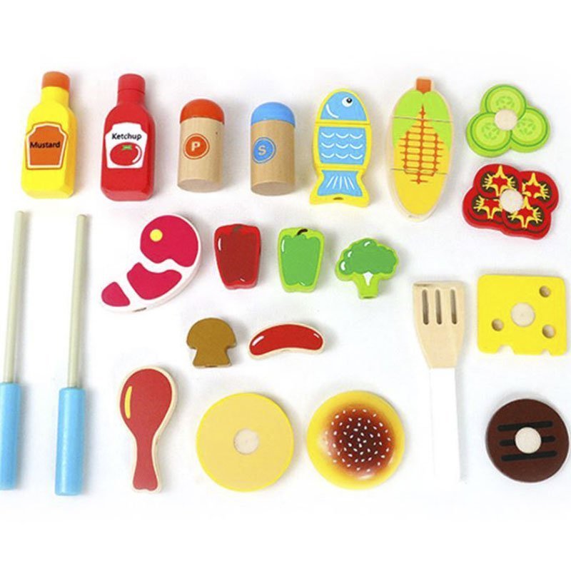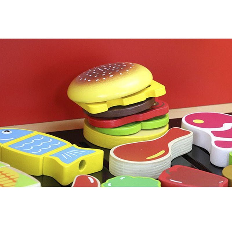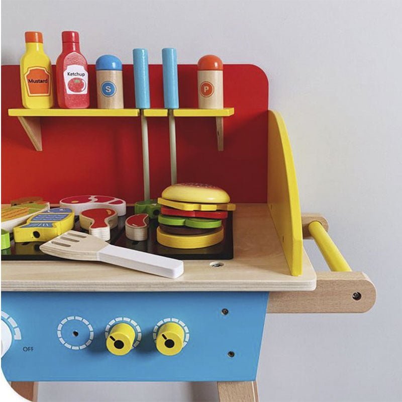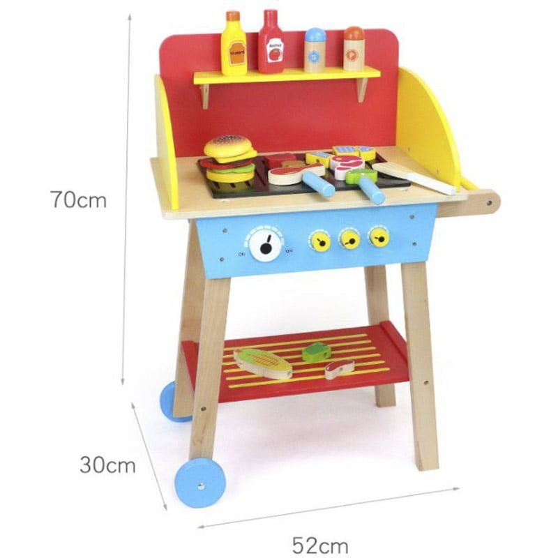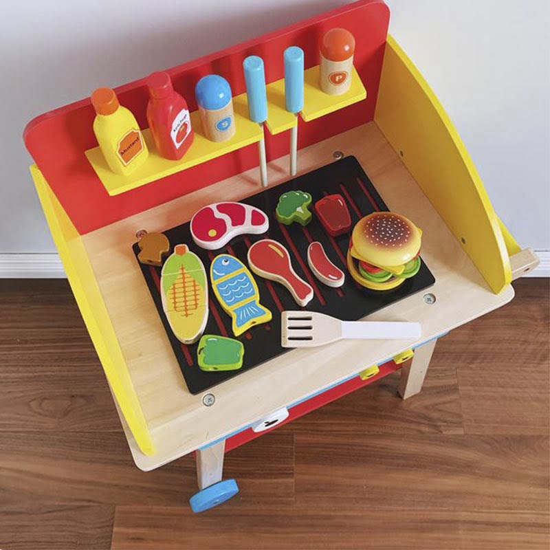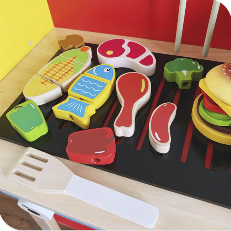 Vrhunska zabava počinje sa roštiljem koji se može koristiti kako unutra tako i napolju! Drveni dečiji roštilj sa sobom donosi puno delova koji pružaju kompletno iskustvo roštiljanja. U ovom kompletu dolaze: roštilj, police, točkići sa jedne strane, posudica za kečap, posudica za senf, posudice za so i biber, riba, kukuruz, krastavac, paradajz, meso, paprika zelena, paprika crvena, brokoli, kobasica, šampinjoni, batak, sir, pljeskavica, gornji i donji deo kajzerice, dva štapa za ražnjiće, viljuška za roštilj. Svaki od navedenih delova može se spajati sa ostalima, razdvajati i koristiti na razne načine prilikom igre. Ovaj dečiji roštilj napravljen je od kvalitetnog dela drveta, realističan, napravljen u dimenzijama odgovarajućim za dečiju igru.