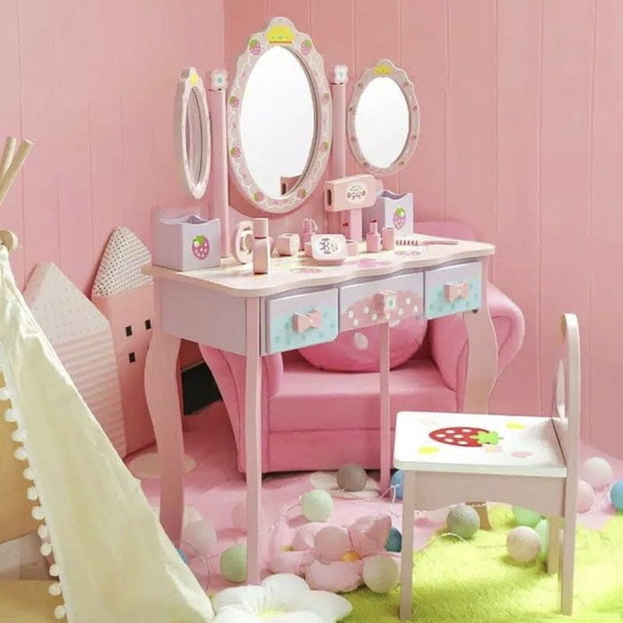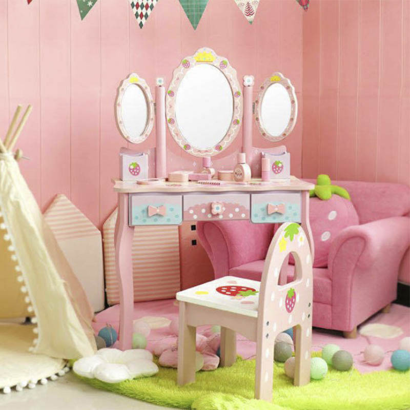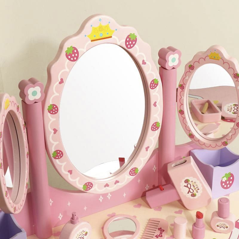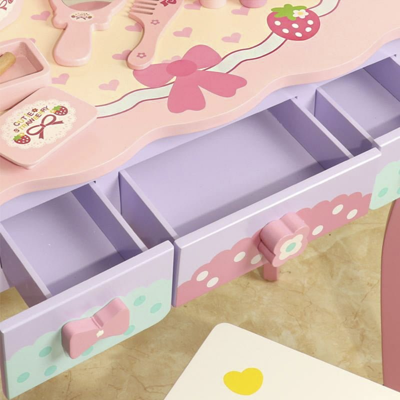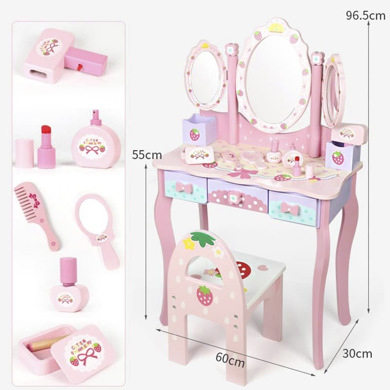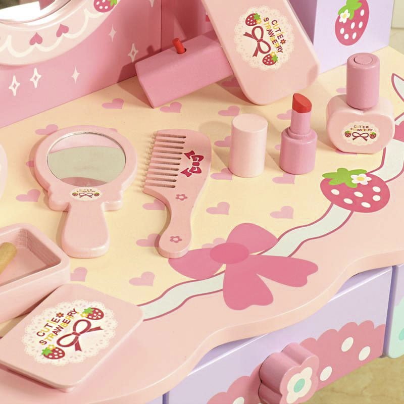 Presladak komplet dečiji sto za šminkanje pun je neodoljivih detalja kao što su jagodice, mašnice, cvetići, srca.. Napravljen je od kvalitetnog drveta u kombinaciji roza, svetlo plave i crvene boje. Ovaj set za devojčice sastoji se od stola i stolice uz više različitih drugih delova koji su dizajnirani kao neodoljivi predmeti za sebe, a to su fioka, glavno ogledalo, posudice na stolu.. Kao i ostali detalji koji su uključeni u ovaj set: fen, karmin, parfem, češalj, ručno ogledalce, lak za nokte, senka za oči.. Svaki od ovih delova napravljeni su u prirodnoj veličini, preslatki, puni detalja, u kombinaciji roza i crvene boje.