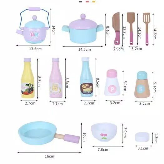 - Od posuđa: čajnik sa poklopcem 13.5x14cm, šerpica sa poklopcem 14.5×9.4cm, tiganj , 16x10cm, činija 7.6×3.9cm, bočice za preliv 2.7×8.5cm (3 komada), so i biber 3.2×5.1cm (2 komada)