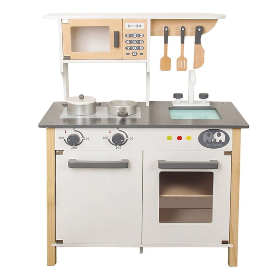 Dečiji drveni kuhinjski set drvena kuhinja predstavlja edukativni alat napravljen od drveta visokog kvaliteta, sa odličnom završnom izradom zaobljenih ivica koji služi da deca kroz igru upoznaju kuhinjsko posuđe i namirnice. Napravljen je tako da deca kroz igru mogu da simuliraju pravljenje obroka i da na taj način razvijaju svoju maštu. Na kuhinji se dugmići okreću kako bi se šporet uključio i isključio, vrata se otvaraju i zatvaraju, a na šporetu postoje dve ringle na kojima može da se ‘kuva’. Ova kuhinja poseduje i rernu, kao i mikrotalasnu pećnicu i sudoperu u kojoj može da se simulira pranje posuđa. Pored toga, uz zabavu deca na ovaj način vežbaju koordinaciju ruku i očiju, uče se dobroj organizaciji u kuhinji.