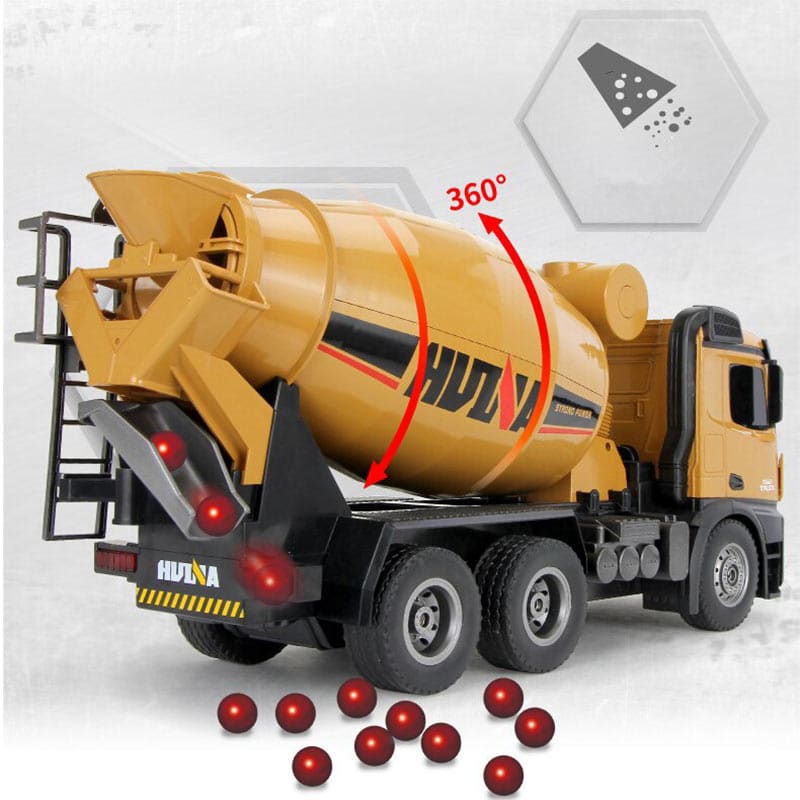 Huina proizvođač donosi nam potpuno realnu igračku Mešalica 1574, dolazi u kombinaciji braon i crne boje. Ova Mešalica potpuno je funkcionalna i može se kretati u svim smerovima (napred, nazad, levo, desno), dok Mešalica ima mogućnost fizičkog okretanja za 360 stepeni. Poseduje simulirani zvuk, automatski se istovara sa zadnje strane. Točkovi su napravljeni od jakog materijala kako bi bili podobni za sve površine. Na prednjoj strani nalaze se LED svetla da dočaraju realističan izgled ove Mešalice. Poseduje daljinski upravljač 2.4GHz, džojstik kojim se jednostavno upravlja, domet je fantastičnih 100m! U isto vreme može da vrši više od jedne operacije. Na daljinskom upraljaču nalazi se antena i indikator svetla, upravljač za pomeranje levo, desno, napred i nazad, dugme za aktivaciju rotiranja miksera, za uključivanje svetla, otvaranje istovara kao i dugme za uključivanje zvuka. Visoko stimulacioni dizajn napravljen je od ekološko prihvatljivih materijala bogate boje. Tehnička vozila neguju dečiju koordinaciju ruku i oka, znanje i druge veštine. Ova mešalica takođe ima mogućnost okretanja za 360 stepeni pri radu, uz prednje osvetljenje. Ugrađeni set baterije jačine 400mAh obezbeđuje do 30min konstantnog rada i zabave.